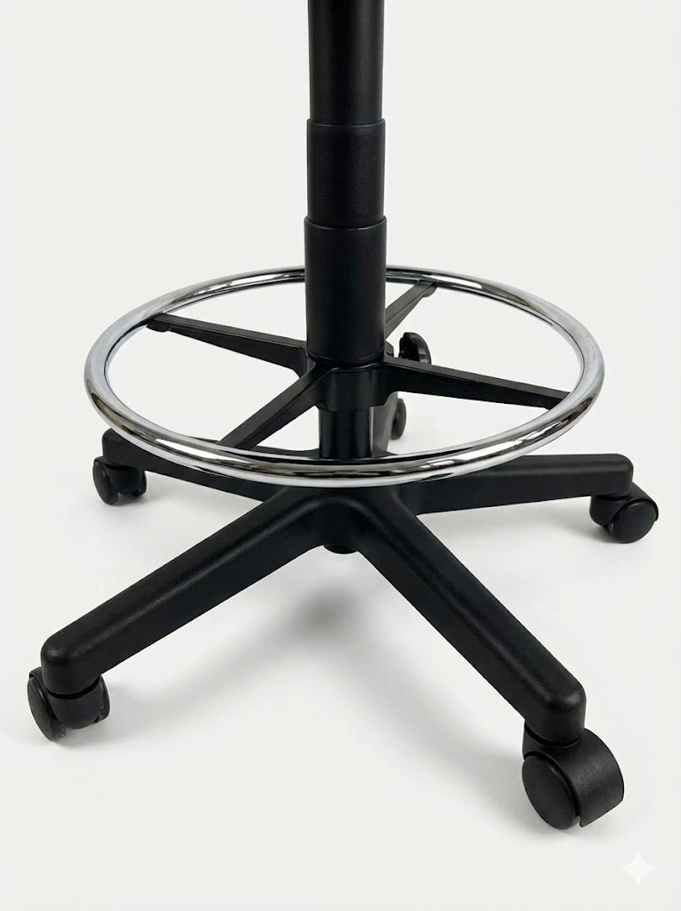 Base estrutural para cadeira, fabricada em material resistente de alta durabilidade, com formato de cinco pontas que garante excelente estabilidade e distribuição de peso. Possui rodízios integrados, permitindo movimentação suave e silenciosa em diferentes tipos de piso. Conta com anel circular de apoio para os pés, proporcionando maior conforto ergonômico durante o uso prolongado. Compatível com pistão a gás central, ideal para cadeiras de escritório, industriais, caixas, bancadas ou uso profissional. Acabamento robusto, projetado para suportar uso contínuo.